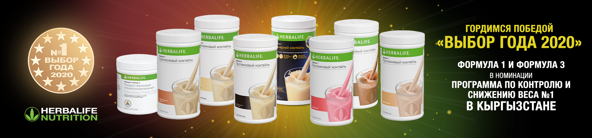 В 2020 году на ежегодном международном фестивале «Выбор Года» в номинации «Программа по контролю и снижению веса № 1 в Кыргызстане» победили сразу два продукта мирового эксперта в области сбалансированного питания – протеиновый коктейль Формула 1 и протеиновая смесь Формула 3 от Herbalife Nutrition. Это основные составляющие программы снижения веса с доказанной клинической эффективностью.