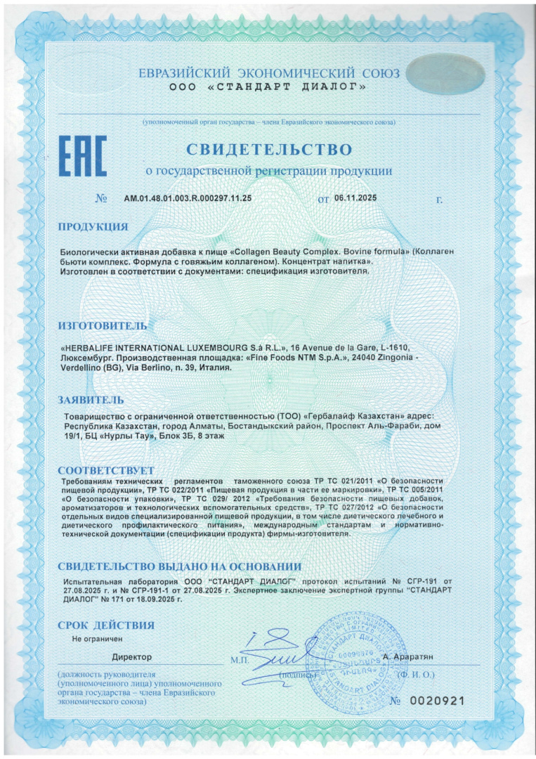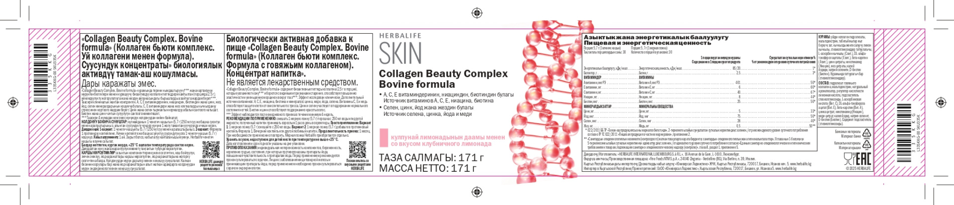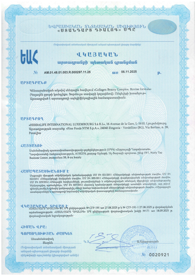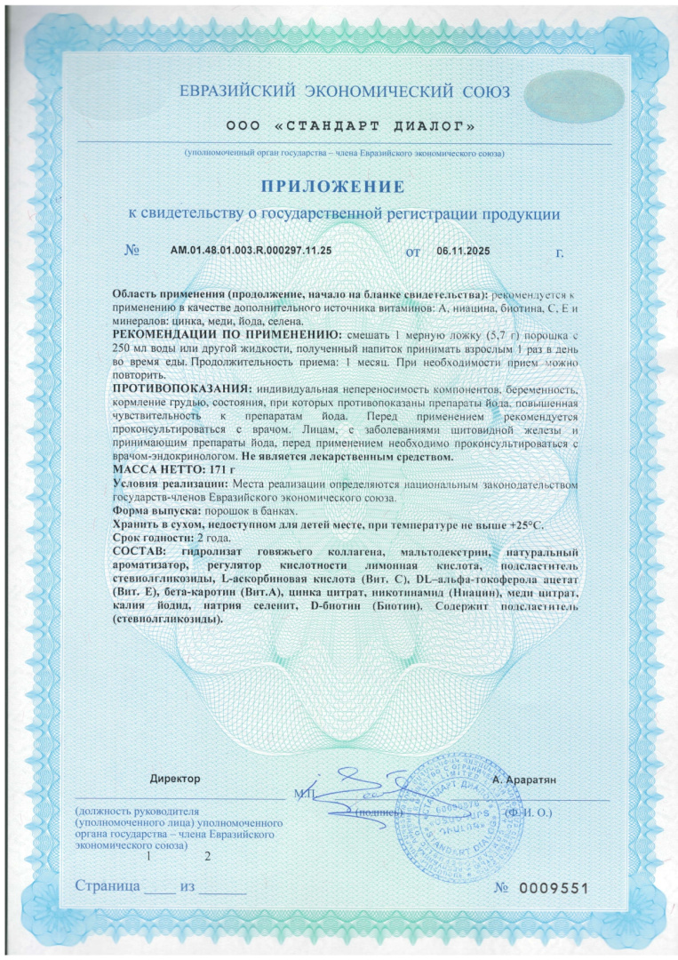 Collagen Beauty Complex.Bovine Formula (Формула с говяжьим коллагеном) – это дополнительный источник витаминов A, C, E, ниацина, биотина и минералов цинка, меди, йода, селена.